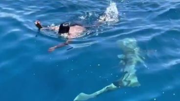 A medida que se acercaba al yate, un tiburón de dos metros apareció a la vista y se alejó antes de que se pudieran ver varios tiburones más comenzando a acercarse.