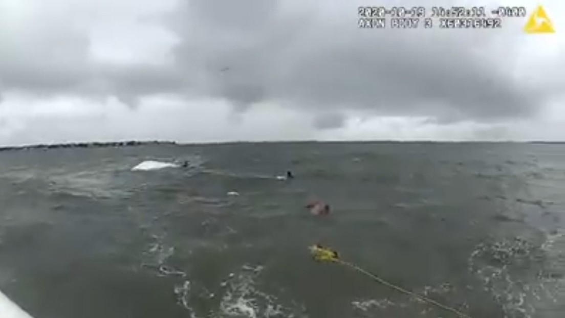 De acuerdo a las autoridades del condado, cuatro adultos y tres niños quedaron varados en el agua después de que su embarcación, de cerca de 6 metros de eslora, se volcara a causa de los fuertes vientos.