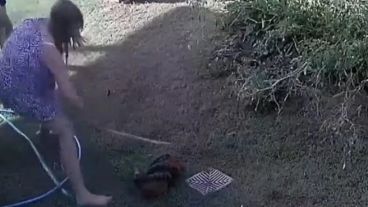 Michelle van Shouwen rescató a su perro de dos meses de vida cuando fue atacado por una pitón diamantina que salió de un arbusto y se prendió del cuello de la mascota. Las imágenes de la cámara de seguridad de la casa de la dueña la muestran desesperada, golpeando y tomando a la serpiente de su cola para rescatar al cachorro.