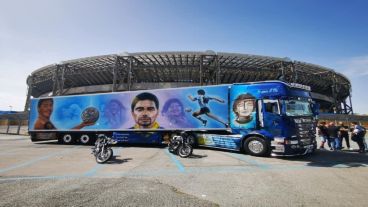 Por empezar, este Scania tiene en la parrilla dibujada la silueta de Maradona. Está corriendo con una pelota pegada a su pie izquierdo. Y por encima del parabrisas lleva la histórica firma de Diego (10).