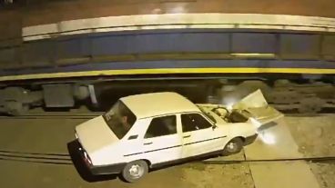 En el video que fue publicado por la cuenta de Twitter @emergenciasAR, se observa cómo un Renault 12 llega lentamente al cruce ferroviario y queda con su trompa sobre las vías.