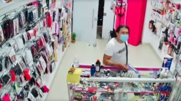 En el video se ve que en dos ocasiones intenta que la empleada le de la espalda al preguntarle por artículos que se encuentran en la pared posterior del mostrador. En un momento, señala hacia el frente y la mujer retrocede caminando de espaldas mientras el sujeto toma el consolador y huye en una carrera hacia el exterior del local.
