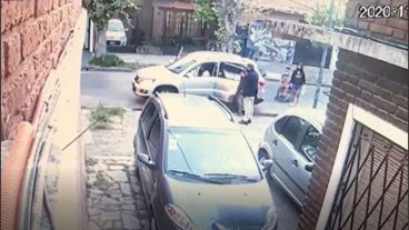 En las imágenes se puede ver cómo el ladrón de campera roja se acercó a su víctima y lo agarró del cuello, mientras lo amenazaba con un arma. El otro abrió la puerta y se subió al vehículo.