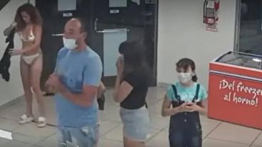 En las cámaras de seguridad se ve el momento exacto en que la mujer se saca su prenda de vestir, entra a la heladería y se dispone a ver los gustos de helado que quería llevar para ella y sus 11 amigos, quienes no tenían barbijo, pero sí ropa.
