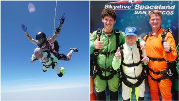 El abuelo de 103 años decidió saltar de un paracaídas para celebrar la graduación de la universidad de su nietos gemelos Kevin y Jason. Además, se le presentó la idea de batir el récord mundial de Guinness al convertirse en el paracaidista más longevo. El momento fue grabado por camarógrafos de la compañía de deportes extremos.
