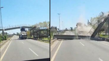 El conductor de un camión con batea circulaba con el remolque levantado y tras chocar contra un puente peatonal, lo derribó. Un usuario de las redes sociales registró el momento y lo compartió: