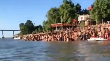 El video que se viralizó en la red social Twitter, muestra a una multitud agolpada en la playa, frente a un parador de la isla frente a Rosario, no muy lejos del puente Rosario-Victoria que se ve de fondo.