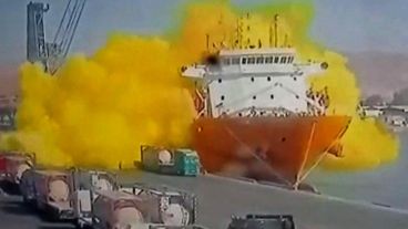 La fuga se produjo cuando el cable que levantaba el tanque para cargarlo a un buque se cortó y éste se precipitó en el suelo del muelle, liberando el gas de color amarillo.