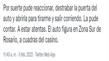 Una vez dentro del auto, el secuestrador trabó las puertas y le quitó el celular para que no pudiera cominucarse con nadie. Dobló por calle Yrigoyen en contramano, intentando escapar con la joven que gritaba y hacía fuerzas para huir. "Me tiré del auto en movimiento, iba muy rápido, me levanté pero no me acuerdo cómo caí", aseguró la joven.