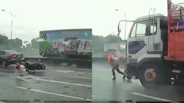 En las últimas horas se viralizó un video de un accidente que ocurrió en Malasia mientras un hombre manejaba por la ruta en plena lluvia, se resbaló, cayó y casi es atropellado por un camión.