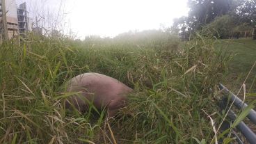 La chancha, de unos 250 kilos que aparentemente había estado preñada hacía poco, fue hallada este domingo por la mañana en el mismo lugar donde el miércoles pasado recataron al cerdo Boby, frente al hospital de Niños Zona Norte.