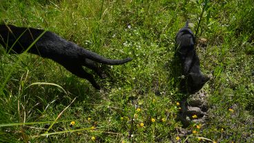 Son las 10.20 de una mañana con un sol sin obstáculos. El calor desciende lento en este viernes de diciembre. Mauro apoya la caja transportadora sobre la pastura y abre la reja. Dos gatos negros, curiosos, se asoman. Primero tantean con unos pasos. Más confiados, dan un par de saltos ágiles de felinos salvajes entre flores amarillas y blancas de la pastura, y se meten en un pajonal bajo la sombra de un algarrobo.