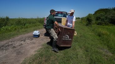 La camioneta parte cargada del Centro de Rescate, Investigación e Interpretación de Fauna “La Esmeralda”, en la ciudad de Santa Fe. Adelante, el equipo para la liberación de animales silvestres. Atrás, un carpincho adulto en una caja de madera con respiradores, dos gatos monteses negros en una jaula transportadora, 13 comadrejas dispuestas en distintas cajas y el ejemplar más sensible: un yacaré inmovilizado de la forma menos invasiva posible.
