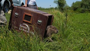 Dentro de la caja más grande, el ojo bien oscuro de la capibara refleja tensión. La tapa lateral se abre frente a una laguna. Asoma el pelaje marrón del roedor más grande del mundo. Decidido, avanza hacia el agua. Chapotea en el barro entre los camalotes y se sumerge de a poco.
