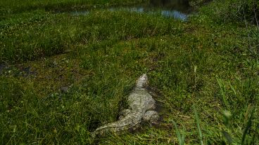 Cuando llega al agua despejada de plantas, nada. Solo la cabeza gigante asoma sobre la superficie. En un par de segundos, cruza la pequeña laguna, sube por la costa y se pierde en una isleta de bosque. El pasaje a la libertad se reduce a esa secuencia breve y en silencio.