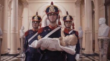 El registro de menos de un minuto muestra a tres integrantes del Regimiento de Granaderos a Caballo recorriendo pasillos, escaleras y patios del edificio histórico mientras trasladan la imagen del Niño Jesús hasta el pesebre armado en uno de los patios internos. La secuencia está acompañada por el villancico “Noche de paz”.