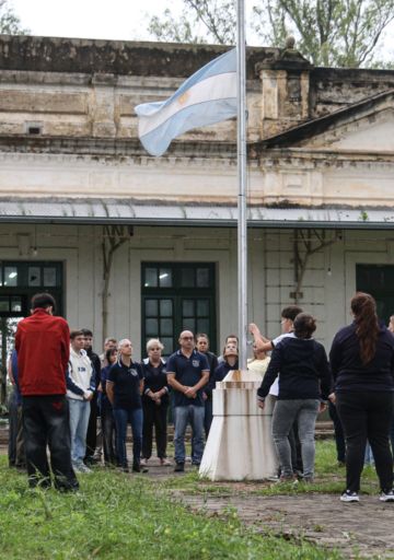 Los adolescentes, maestros y coordinadores se forman alrededor del mástil. Hacen un minuto de silencio y comienzan a izar la bandera de forma colectiva. Primero una alumna, después un compañero con chomba, una docente y así hasta el octavo y último, que parece una especie de homenaje. Es Fabio, el maestro de la primaria (no es el portero) que desarmó a Gino y evitó una masacre mayor. Además del homicidio de Ian Cabrera, fueron heridos dos adolescentes por los disparos y otros seis sufrieron distintas lesiones.