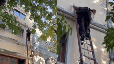 En las imágenes compartidas por Telenoche (El Tres), se puede observar el preciso instante en que uno de los bomberos logra sujetar al animal mientras, desde la vereda, vecinos y familiares aguardaban con una sábana extendida por si el perrito caía.