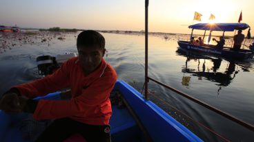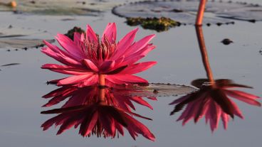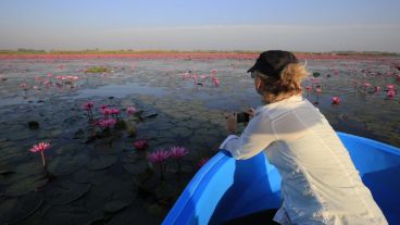 En esta época del año estas plantas flotantes con tonos rojos y rosados colorean el lago Nong Harn, conocido localmente como Talay Bua Daeng o Mar de los lotos rojos, en la provincia de Udon Thaniel al noreste del país asiático. Muchos visitantes disfrutan de un paisaje de película