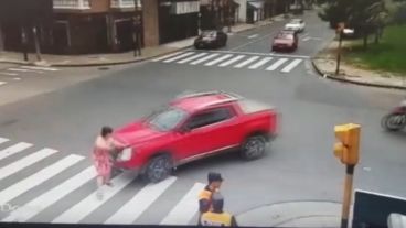 Las imágenes son impactantes. La camioneta dobla en la esquina, cuando la mujer cruzaba correctamente por la senda peatonal. El vehículo, en lugar de frenar para esperar le paso de la transeúnte, acelera y atropella con violencia a la víctima.