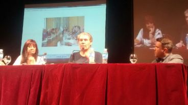 Víctor Hugo estuvo acompañado en el escenario por la secretaria adjunta del Sindicato de Prensa Rosario (SPR), Alicia Simeoni, -uno de los organizadores del encuentro- y el periodista de Radio 2, Jesús Emiliano.