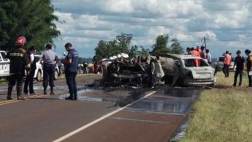 Al menos siete personas murieron este domingo cuando dos automóviles que circulaban por la ruta 105 chocaron y se prendieron fuego a la altura de la localidad misionera de San José, informaron medios locales.