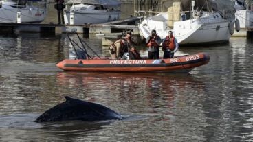 Según publicó La Nación, la ballena sigue atrapada en el dique 4 de Puerto Madero. Esta mañana los prefectos lograron dar con ella e intentaban reconducirla a su hábitat natural ya que es un animal de agua salada. El problema surge cuando el animal se sumerge y entonces los especialistas la pierden de vista; esto fue, justamente lo que sucedió este lunes por noche.