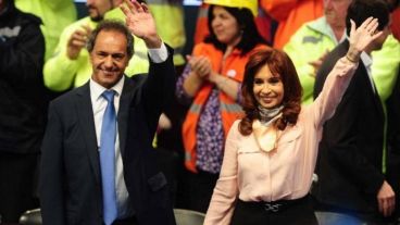 La presidenta Cristina Fernández de Kirchner volvió a encabezar un acto este lunes emitido en cadena nacional. Estuvo acompañada por el candidato a presidente del Frente para la Victoria, Daniel Scioli, y a su lado expresó: “Hay que seguir con el proyecto para que sigan las obras”.