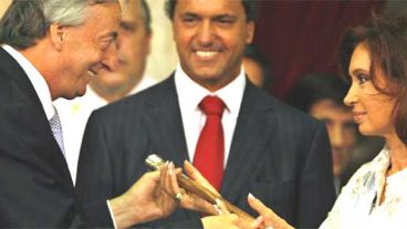 Ya en el recinto, el vicepresidente saliente Daniel Scioli le tomó juramento a Cristina y a su vice, el mendocino Julio Cobos, en una ceremonia en la que Néstor Kirchner parecía más emocionado que su esposa. A Kirchner, justamente, le dedicó Cristina la primera parte de su discurso.
