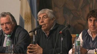El secretario general de la CGT Azopardo, Hugo Moyano; el titular de la CGT Azul y Blanca, Luis Barrionuevo ; el secretario general de la Uatre, Gerónimo Momo Venegas; y el secretario general de la CTA opositora, Pablo Micheli; encabezaron la conferencia acompañados de representantes de otros sindicatos.