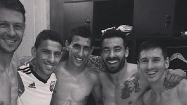 Maxi Rodríguez (@MR11ok) compartió una imagen de los cuatro de acá más el defensor ex River y escribió en su cuenta: "Después de la victoria en el vestuario con la banda.. Vamos Argentina!!!". Y subió una foto: