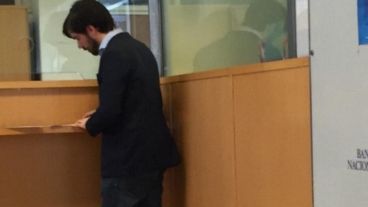 En la imagen se ve al dirigente en un sector del Banco Nación dedicado a la compra de moneda extranjera.
