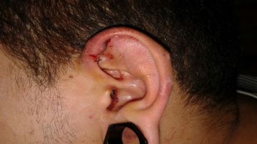 “Este patovica entregó a mi hijo a otro compañero, otro seguridad del local que portaba una camisa a rayas claras el cual lo sujetó por detrás mientras continuaba sacándolo del establecimiento, no sin antes golpearlo con sus puños en la parrilla costal izquierda y mordiéndolo en su oreja izquierda, en la que le produjo un gran corte (según puede observarse en las imágenes proporcionadas por la familia del joven a Rosario3.com). Luego de esto, lo arrojó todo ensangrentado en la puerta de ingreso del boliche, donde se encontraba el grupo agresor que dentro de la disco lo había golpeado”, precisó la madre.