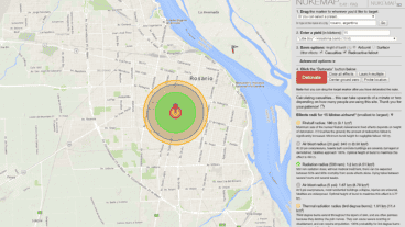 La plataforma es muy simple de usar. Sólo hay que ir con el cursor a dónde dice “Or type in the name of a city:” y poner “rosario, argentina”—o la ciudad donde se quiera visualizar los efectos de una bomba A—; luego elegir el tipo de bomba a simular en el desplegable del punto 2 y marcar todos los casilleros del punto 3. Realizado este paso hay que darle click al botón “Detonate”.