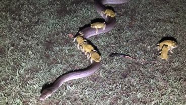 La imagen es realmente extraña: diez sapos se pasean montados en el lomo de una serpiente en medio de un jardín. Paul Mock sacó la foto en su casa de la ciudad australiana de Kununurra.