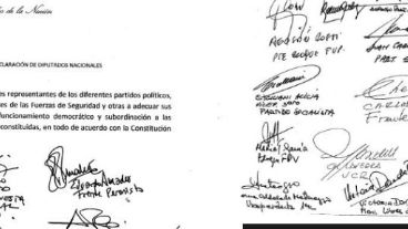 La declaración lleva las firmas de diputados de representantes de todas las fuerzas políticas: Federico Pinedo (PRO), Eduardo Amadeo (Frente Peronista), Juan Carlos Zabalza y Alicia Ciciliani (PS, Frente Amplio Progresista), Alfonso Prat Gay (Cocalición Cívica), Jualiana Di Tullio (Frente para la Victoria), Carlos Heller (Nuevo Encuentro), María Teresa García (FPV), Ricardo Gil Lavedra (UCR), Victoria Donda ( Libres del Sur, FAP), Patricia Bullrich (Bloque Unión por Todos), Norma Abdala de Matarazzo (Frente Cívico por Santiago del Estero) y Agustin Rossi (FPV).