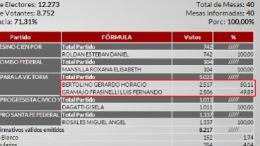 Según dijo Bertolino al programa La primera de la tarde (Radio 2), la clave de la diferencia entre ambos resultados radica en la mesa 3462. En un primer momento, allí se impuso la lista oficialista “Por más Tostado” por 88 a 69 (diferencia de 19 votos). Pero en el escrutinio definitivo esos números aparecían invertidos: es decir Gramajo tenía sus 88 sufragios y entonces el resultado final fue en favor de “Todos por Nueve de Julio” por 25 votos (hay una diferencia extra por votos recurridos). La comparación de las dos actas se puede ver en las imágenes de esta nota, además del escrutinio provisorio.