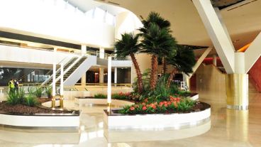 El hall de ingreso –donde se encuentran el Dutty Free, el punto de información turística, sucursal bancaria y otros servicios– es casi el único espacio con luz natural y una vez que se traspasan las escaleras mecánicas de la entrada aunque todavía sea de día, el contexto de leds y alfombrado hacen perder la noción de tiempo y todo supone que cayó la noche sin caer.