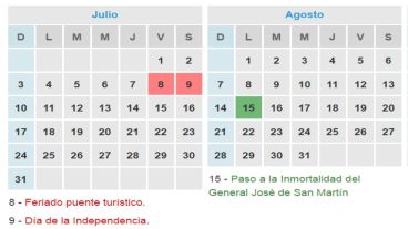 El decreto 1786/2013 establece como feriados puente el 8 de julio y el 9 de diciembre. En agosto el feriado del 17 por el Paso a la inmortalidad del General San Martín se correrá al 15.