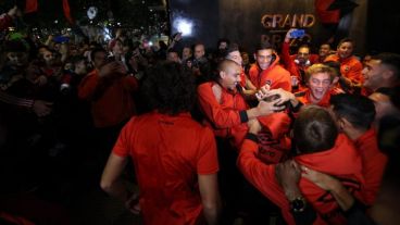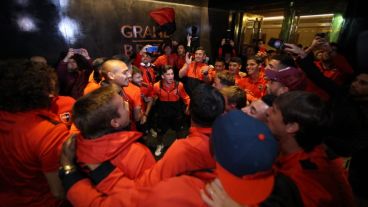 El plantel de Newell's salió a la puerta del hotel para agradecer el apoyo de los hinchas