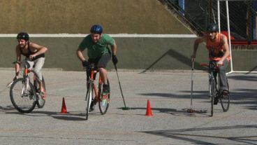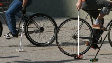 “Son tres contra tres, pueden ser mujeres y varones. No hay diferencias. El partido dura 10 minutos o lo que duran 5 goles, lo que suceda primero. Con el taco en una mano, sólo te queda la otra para manejar la bici, no podés poner los pies en el piso, y hay que seguir la bocha”, precisa a modo de instructivo rápido. Es curioso verlos, furiosos ciclistas dando miles de vueltas en una cancha de 40 por 20 metros, frenando, acelerando, pegando palazos y pedaleando detrás de una pelotita que se vuelve incontrolable.
