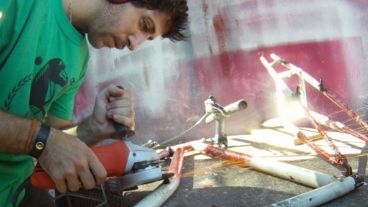 La carencia de una industria nacional de polo bike–desarrollada, por el contrario, en Estados Unidos, Canadá, Irlanda e Inglaterra– en el país los obligó a agudizar sus capacidades. En un taller se reúnen y ponen a punto las mulas, y arman sus propios tacos con pedazos de caños de gas: “Cuando vemos pasar al camioncito de Litoral Gas, los paramos y les pedimos “un pedacito, un pedacito””, confiesa entre risas.