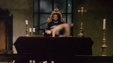 Luego utilizaron montajes religiosos para hacer fotos como un altar y un confesionario. Asimismo, la "producción" incluye un desnudo de Vanucci mientras una pareja reta a un niño.