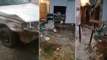 La estructura de características precarias fue violentada por el vehículo que derribó la puerta y provocó daños: rompió una mesa, el televisor y otras pertenencias. Antes, golpeó a un auto blanco que estaba en la puerta.