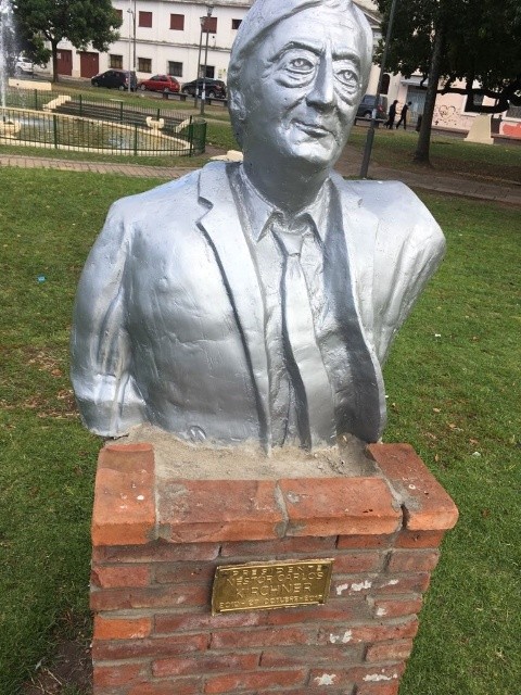 El busto colocado este fin de semana en las Cuatro Plazas, luego de un acto en homenaje al fallecido ex presidente de la Nación, tiene una particularidad: le falta el brazo izquierdo.