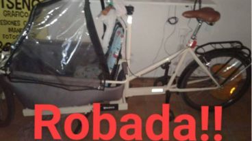 Melynda es una joven mamá rosarina que vende ropa en las ferias de la ciudad y recorría sus calles con una bicicleta muy especial. El rodado mide dos metros y tiene frente al manubrio un canasto que le servía para transportar las prendas. Allí también solían viajar sus dos hijos. Se la robaron la semana pasada y ahora pide ayuda para recuperarla.