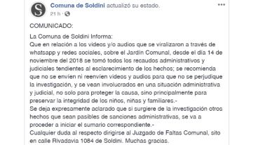 "En relación a los videos y/o audios que se viralizaron a través de whatsapp y redes sociales, sobre el Jardín Comunal, desde el día 14 de noviembre del 2018 se tomó todos los recaudos administrativos y judiciales tendientes al esclarecimiento de los hechos; se recomienda que no se envíen ni reenvíen videos y audios para que no se perjudique la investigación, y se vean involucrados en una situación administrativa y judicial, no solo para proteger la causa, sino principalmente para preservar la integridad de los niños, niñas y familiares", señala el texto difundido.