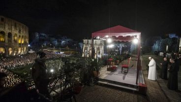 Ante miles de devotos y peregrinos de todo el mundo que se acercaron a la capital italiana para participar del principal momento del Viernes Santo -que recuerda las 14 estaciones de la cruz que recorrió Jesucristo desde Jerusalén hasta su crucifixión-, Francisco siguió el acto desde la colina del Palatino, situada frente al Anfiteatro Flavio.