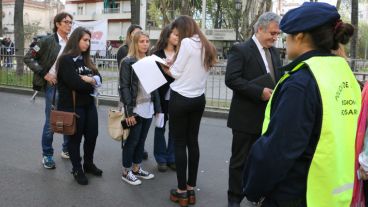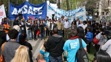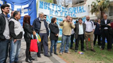 A las 12, sobre el cantero de Oroño, casi esquina Zeballos, un amplio arco de dirigentes inicia "la verdadera audiencia pública y no la farsa que se está llevando a cabo adentro y en todo el país", dice Milito. Sonia Alesso, de Amsafé, añade que los mismos problemas se registraron en las sedes del resto del país. Alicia Simeoni, del Sindicato de Prensa, añade que impedir el ingreso de cámaras es "tapar los ojos de los periodistas" e impedir la circulación de la información sin condicionamientos.