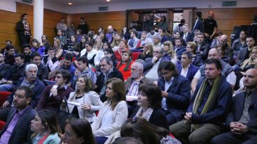 Aranguren cumple con los 20 minutos de tiempo y cierra su presentación. Más de la mitad de la sala en Rosario lo aplaude y el resto no. Uno de los que no aplaudió, el concejal del Movimiento Evita, Eduardo Toniolli, se levanta y sale. "Chicos vuelvan al Concejo que no quedó nadie allá", les dice a un grupo.